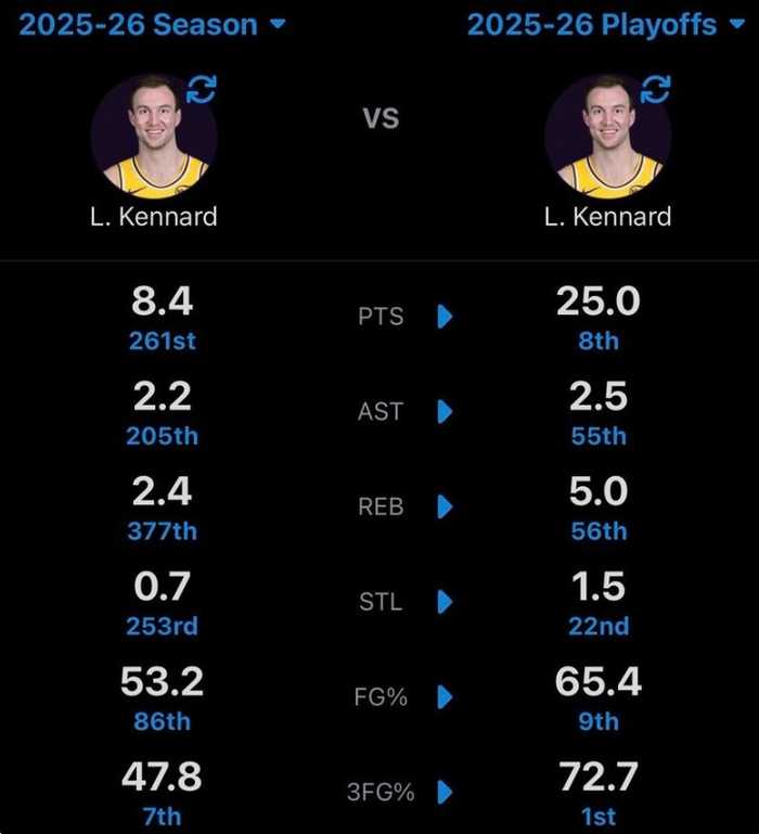 肯纳德本赛季常规赛场均8.4分2.3板2.2助 季后赛场均25分5板2.5助 发布时间:22/04/2026, 15:28:27 4月22日讯 NBA季后赛西部首轮G2,湖人101-94战胜火箭。 此役,肯纳德首发出战42分钟,投篮13中8,三分球6中3,罚球4中4,拿到23分6篮板2助攻3抢断。 在过去两战,肯纳德场均出战40.1分钟,砍下25分5篮板2.5助攻1.5抢断,投篮命中率65.4%,三分72.7%,罚球80%。 在常规赛中,肯纳德场均能得到8.4分2.3篮板2.2助攻。 标签: 雨燕360体育直播网